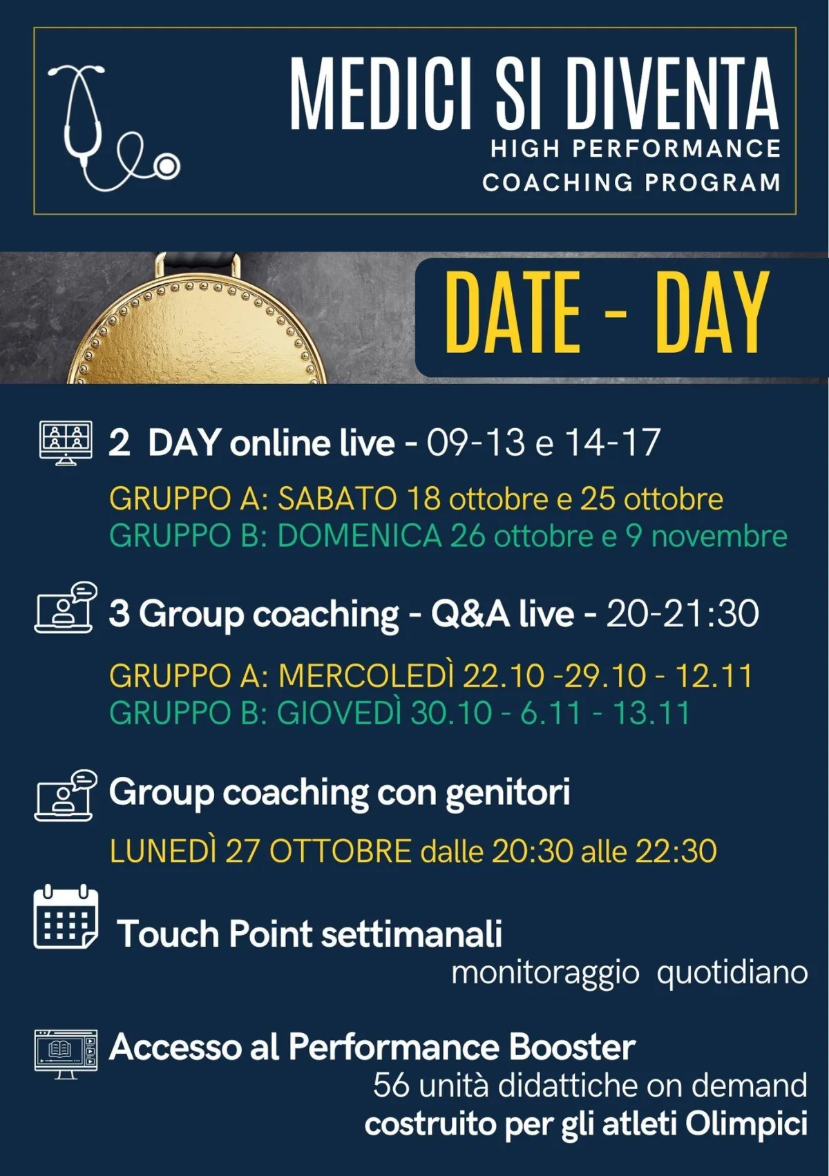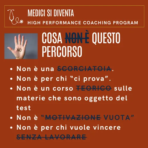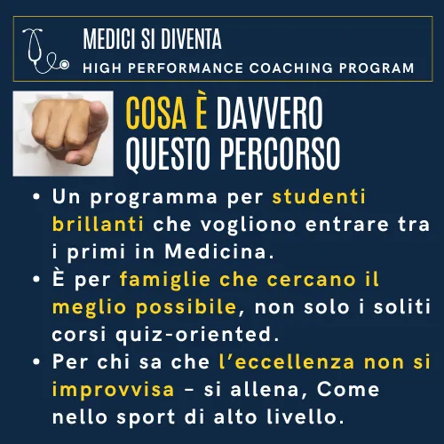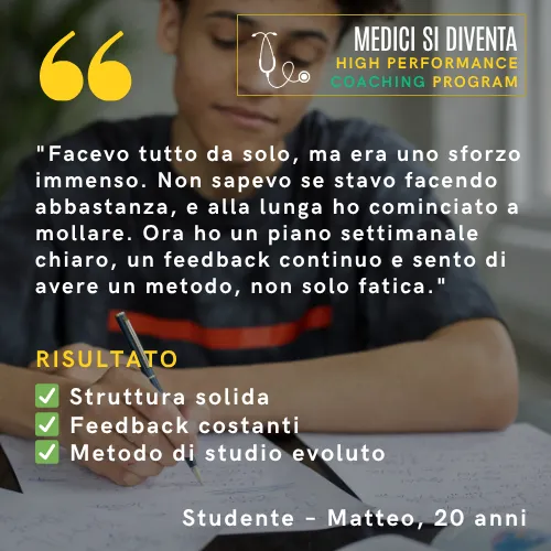 ✔️ Assolutamente sì. Stai accedendo a un programma costruito su misura, pensato per affrontare uno dei momenti più selettivi della vita accademica: il semestre filtro di Medicina. Comprende coaching individuale, supporto quotidiano, monitoraggio costante e un protocollo collaudato con atleti olimpici. La sua forza è nell’individualizzazione e nella cura dei dettagli.