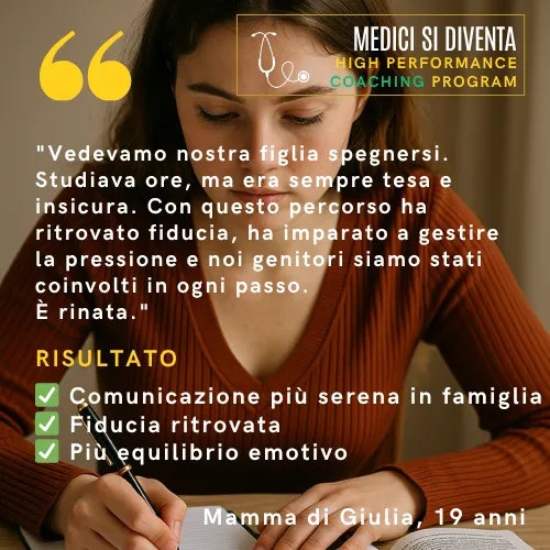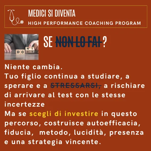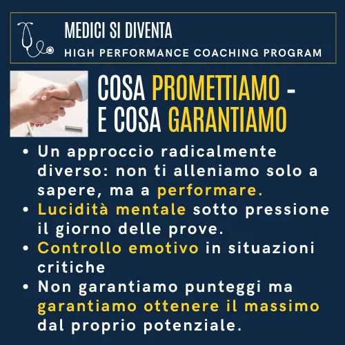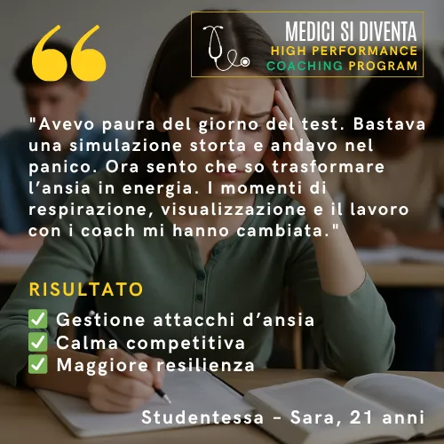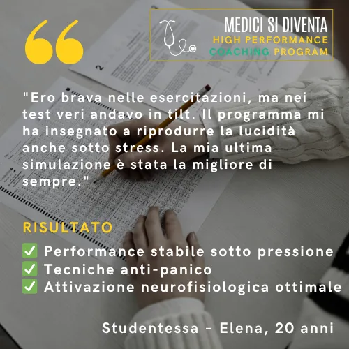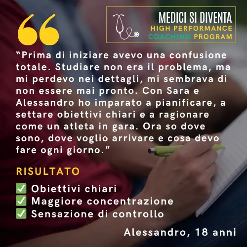 ✔️ Perfettamente compatibile. Il nostro programma non sostituisce la preparazione teorica, la potenzia. Lavoriamo sulla gestione dell’ansia, la concentrazione, l’efficacia dello studio e la performance durante gli esami. In un semestre in cui i 3 esami vanno superati tutti – con almeno 18/30 – e conta la posizione in graduatoria per entrare, non basta sapere. Serve performare con lucidità.